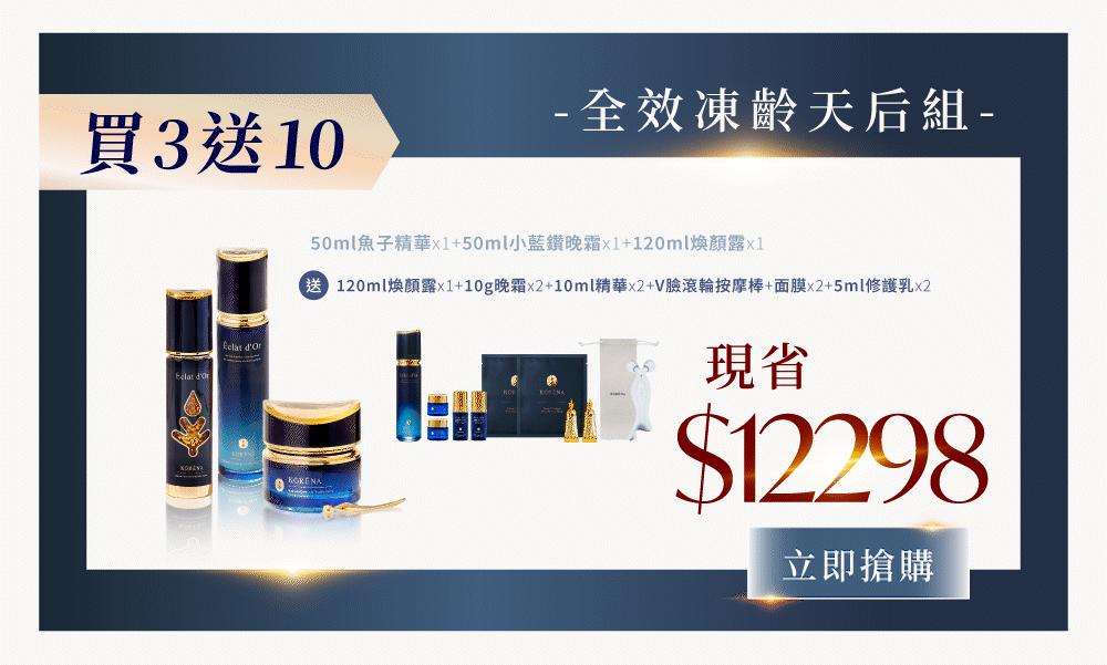 【送】 120ml煥顏露+10g晚霜*2+10ml魚子精華*2+V臉滾輪按摩棒+面膜*2+5ml修護乳*2