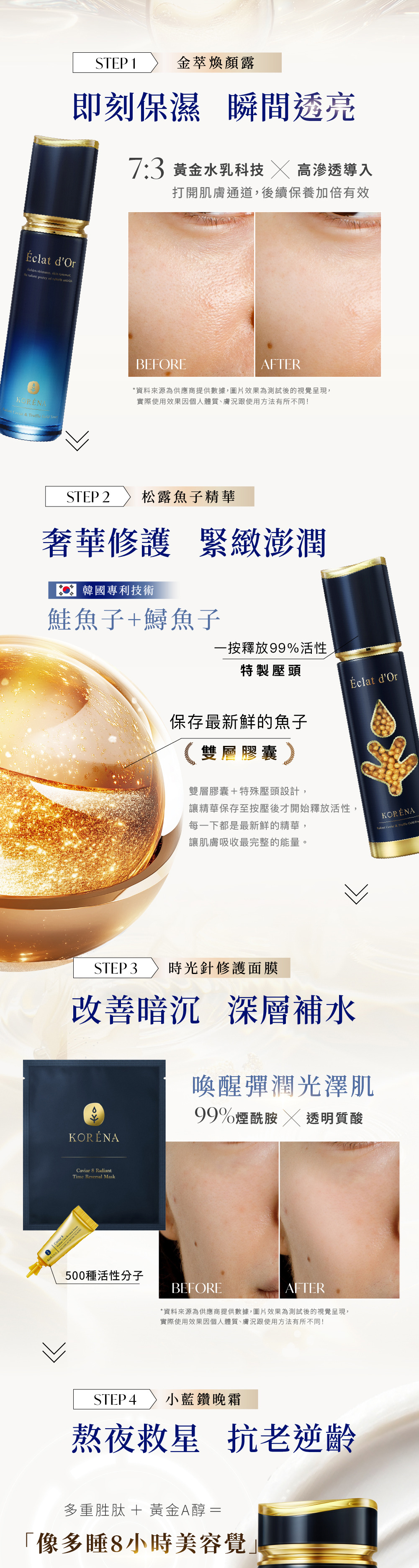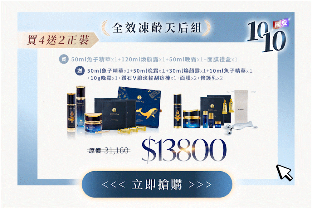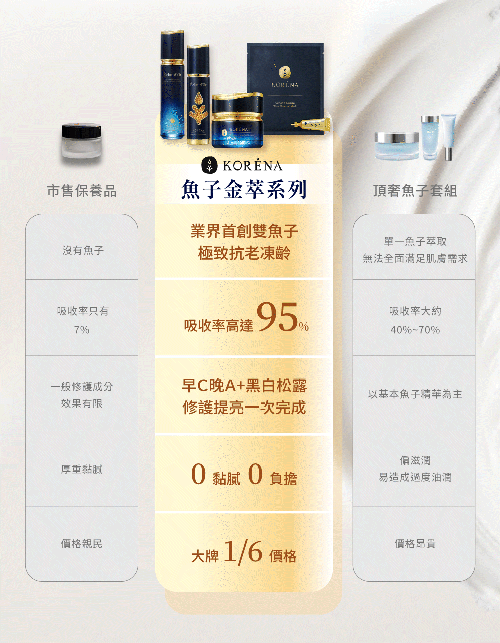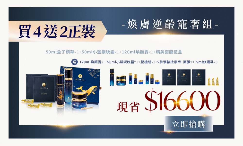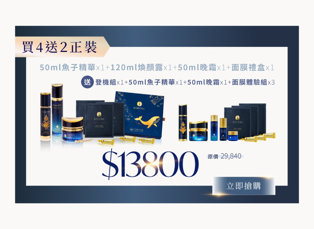 【組合內容】50ml魚子精華*1+50ml小藍鑽晚霜*1+120ml煥顏露*1+面膜禮盒*1